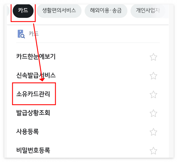 - 은행 어플 실행 후 '메뉴' - '카드' - 'my' - '카드관리' - '카드조회/재발급' 순서대로 진행합니다.