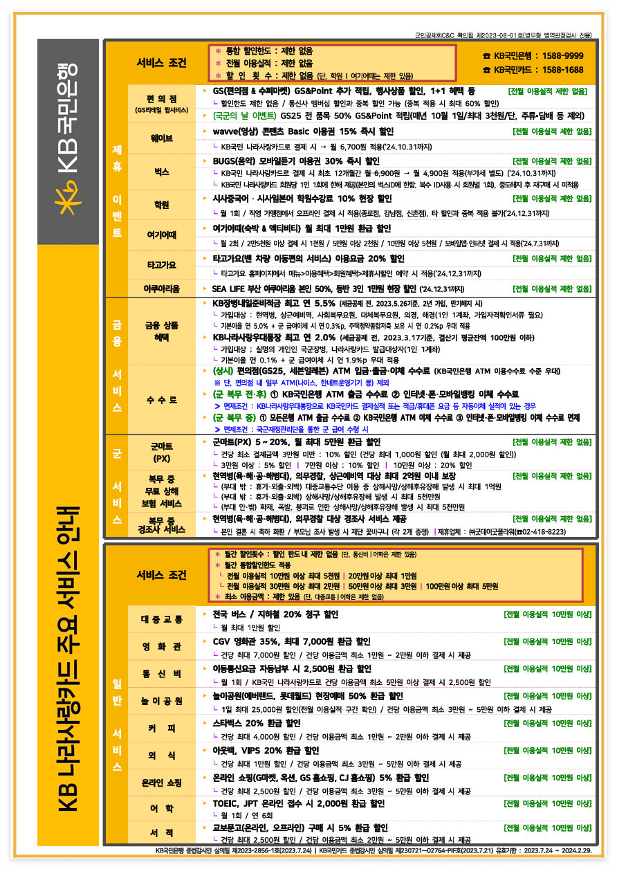 | PX 및 편의점 | - CU, GS25, 전국 군부대 PX 10% 청구할인(월 2회, 1회 이용금액 1만 원 한도) - 1일 1회 CU 5% 추가 현장할인 (주류를 제외한 음료, 빙과류, 신선식품 한정) |